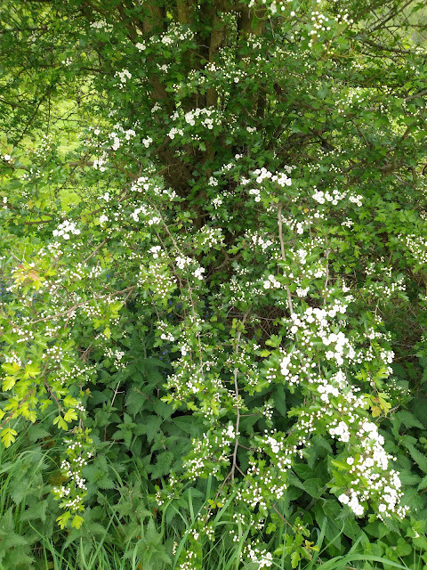 | Floral arrangement at Glascote - wisteria growing through a hawthorn tree. |